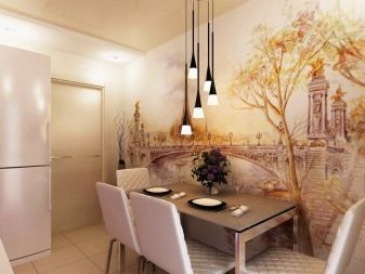 تبدو المناظر الطبيعية جيدة في المطابخ الصغيرة – فهي توسع المساحة بصريًا (يمكن قصها من ورق الحائط ، أو تجميعها بنفسك ، مما يؤدي إلى إنشاء فسيفساء أو زخرفة من خطوط ورق الحائط متعددة الألوان). تبدو صور الحيوانات الأليفة مضحكة في المطبخ – صورة ظلية قطة سوداء على خلفية بيضاء بأسلوب رسومات بانكسي ، تصل بمخلبها إلى طاولة مطبخ حقيقية ، صورة لكلب مفضل تم إنشاؤها من قطع ورق حائط مطابقة للون . هناك ، بعد كل شيء ، ورق حائط رمادي ، وأصفر-أحمر ، وأبيض ، يمكنك اختيار شيء يتناسب مع لون معطف صديق ذو أربعة أرجل. أو ، على العكس من ذلك ، قم بإنشاء صورة له بأسلوب تعبيري ، من قطع صغيرة ذات ألوان غير عادية.