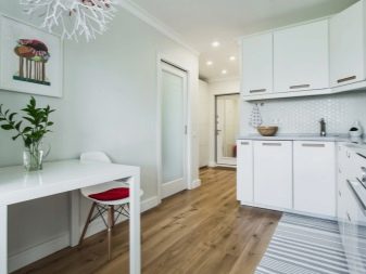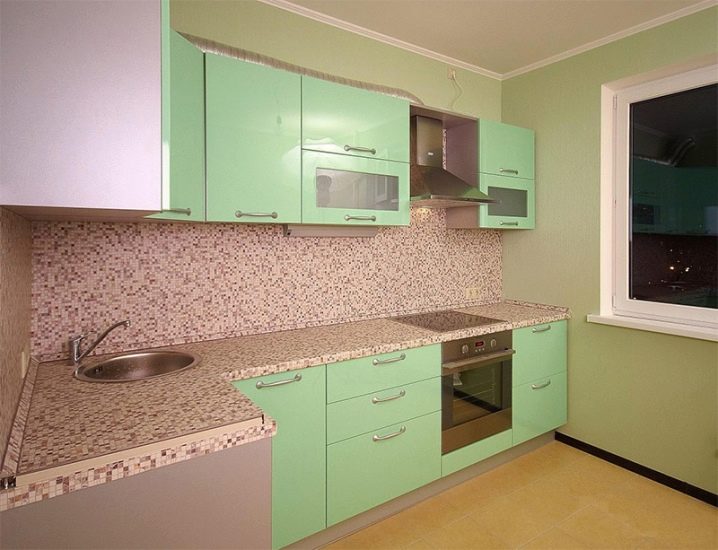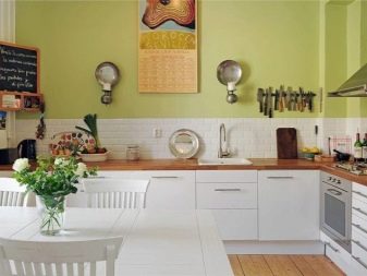 المطبخ الموضح في الصورة الثانية تم تجديده بنفس الطريقة. تعمل النغمة الخضراء الفاتحة للطلاء على توسيع المساحة الصغيرة قليلاً ، ولكنها في نفس الوقت تتناقض بشكل حاد مع المريلة في اللون والملمس.