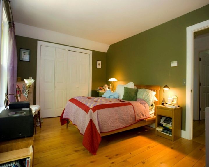 الغرفة بأكملها مطلية بلون واحد – أخضر ، والباب الأبيض في الخلفية يعمل كلكنة هنا ، على الرغم من أنه يمكن اعتبار بياضات الأسرّة بدرجات اللون الأحمر على هذا النحو. تم استخدام اللوح الجصي لتسوية الجدران..
