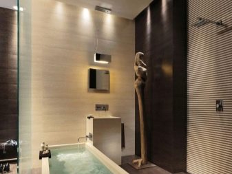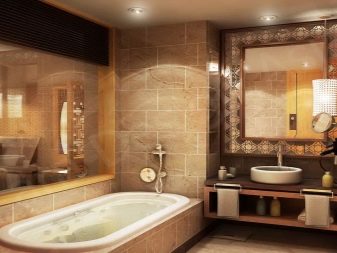تسود الراحة والاسترخاء والخصوصية في الحمام البيج. عند تزيين هذه الغرفة ، يجب أن يزين البيج أيضًا باقي العناصر الداخلية – وهذا سيخلق ديكورًا شاملاً وجذابًا. هناك طلب كبير على بلاط “الخيزران” – يتم وضع أشكال حجرية خضراء وصور لأوراق هذا النبات على قوالبه.