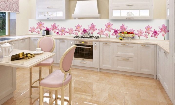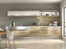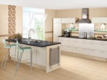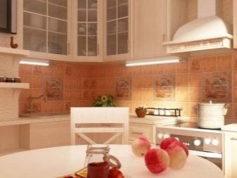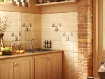 في المطبخ ، غالبًا ما تستخدم البلاط لتزيين منطقة العمل (ساحة). يمكن أن يكون حجم النرد (20 × 30 ، 25 × 50 سم ونماذج أخرى) وشكلها أيًا. أفضل شكل هو مستطيل أو مربع. الفسيفساء البيج تبدو أصلية.