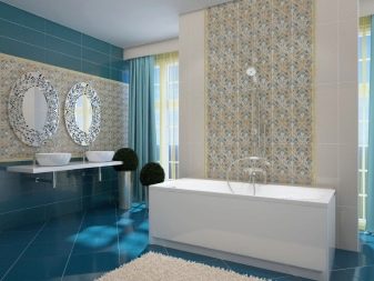 - أزرق. سيحول اللون البيج مع الأزرق والأزرق الفاتح الحمام العادي إلى حمام أنيق وفعال. يمكن أن يتنوع تشبع الألوان. لتأثير التباين ، من الضروري الجمع بين لون أفتح وآخر مشبع..