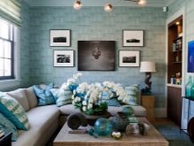 - غرفة المعيشة. يجدر البدء باستخدام اللون الأزرق في داخل غرفة المعيشة. هنا ، يُنصح المصممون بالاستغناء عن الأنماط الكبيرة. إذا كانت هناك أنماط على سطح الغطاء ، فيجب دمجها مع الأريكة المغطاة بالمطبوعات.