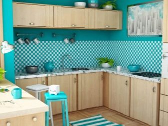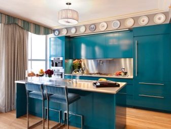 بالمناسبة ، سيكون التأثير النفسي للون الأزرق أيضًا مكافأة ممتازة للفتيات. يقول علماء النفس أن جميع درجات اللون الأزرق تقلل الشهية ، وتمنعنا من الأكل أكثر من المعتاد. لذلك ، إذا كنت مهتمًا بالحفاظ على الشكل الخاص بك في حالة ممتازة أو كنت تخطط فقط لفقدان الوزن ، فستساعدك الخلفية الزرقاء في المطبخ في ذلك..