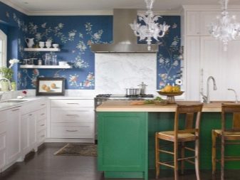 بالنسبة للمطبخ ، بالطبع ، من المفيد شراء ورق حائط قابل للغسل. إنهم ينظفون جيدًا ، لذلك سوف ينجون من عملية الطهي حتى في أصعب الأطباق. في المطبخ ، يتناسب اللون الأزرق جيدًا مع مجموعة بيضاء أو بيج..
