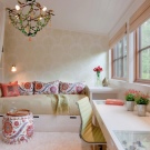 - بالإضافة إلى ذلك ، يمكن أن يؤدي وجود كمية كبيرة من الضوء إلى تعمية العينين وإزعاج الشخص الموجود في الغرفة. لتجنب ذلك ، اختر أثاثًا فاتح اللون بنمط مثير للاهتمام يتناقض مع اللون الأساسي. وبالتالي ، سوف تقوم بتعيين النمط العام للغرفة (يمكن استخدام الزخرفة الشرقية أو الأحرف الأولى كنمط) وتخفيف البياض.