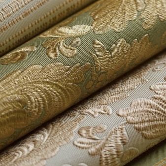 أسطح النسيج هي أغلى أغطية للجدران. النسيج المزين بأنماط يبدو فخمًا حقًا. كانت هذه الخلفيات النسيجية ، المكملة بطبعات رائعة ، هي التي استخدمت في منازل الأرستقراطيين والملوك منذ عقود عديدة. الآن تم تبسيط تقنية إنشائها إلى حد كبير., هذا هو السبب في أنها أرخص عدة مرات.