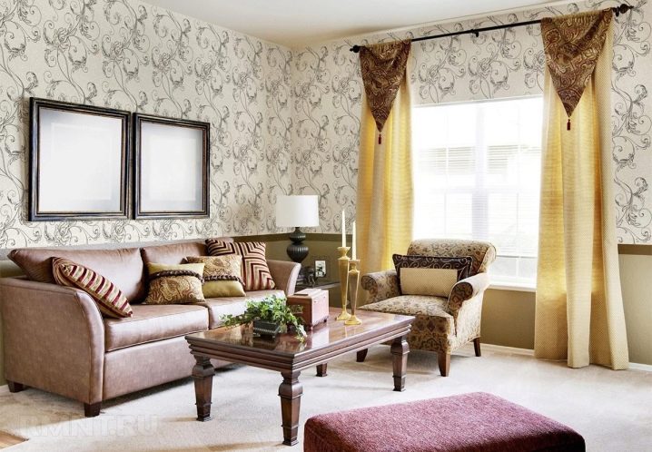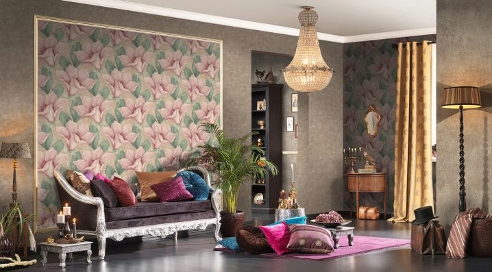 تبدو الطلاءات اللامعة رائعة في الداخل ، كلا النموذجين بنمط وأخرى أحادية اللون. في غرفة المعيشة ، يوصي المصممون بلصق ورق الحائط بطبعات مجردة. ولكن إذا كانت الغرفة مزينة بأسلوب حديث ، يمكنك إعطاء الأفضلية للنماذج ذات النمط الهندسي. وللحصول على المزيد من التصميمات الداخلية الكلاسيكية ، فإن الطرز ذات الطباعة الحريرية والصور ذات الألوان الكبيرة مثالية..