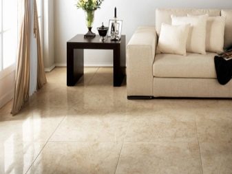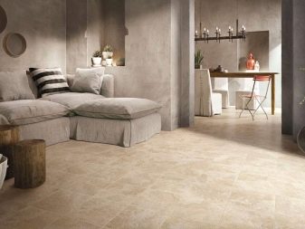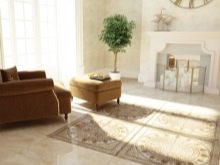- البلاط البيج “يستجيب” لمصادر الإضاءة الإضافية. عن طريق تثبيت المصابيح في غرفة المعيشة ، والتي سينعكس ضوءها على الأرضيات المبلطة ، ستمنح الغرفة لمعانًا خاصًا ووقارًا ؛