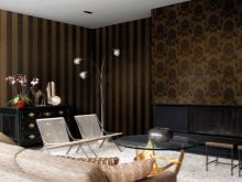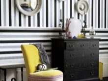 ستساعد المواد المخططة على توسيع المساحة. مزيج من الظلال الداكنة مع الألوان الفضية والذهبية أو غيرها من الألوان المتناقضة يمد الغرفة ويجعلها أكبر بصريًا. يمكنك العثور على خيارات بنمط ، ويمكن أن تختلف عن القاعدة ببضعة ظلال فقط ، أو أن تكون متناقضة تمامًا. نماذج مشهورة مع حرف واحد فقط ، مع دوائر.