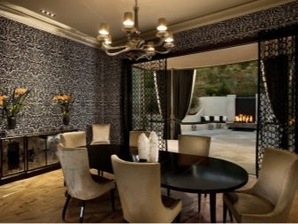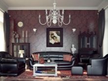 من أجل تنويع المناطق الداخلية ، لا يمكنك اختيار ورق الحائط الداكن العادي ، ولكن الخيارات ذات النمط. لذلك ، يمكن أن تكون الزخارف المختلفة بمثابة ديكور ، على سبيل المثال ، النسخة الموجودة تحت الجلد تحظى بشعبية كبيرة اليوم. يمكن أن تخلق المواد الداكنة ذات ملمس الجلد الأصلي تصميمًا داخليًا فريدًا حقًا.