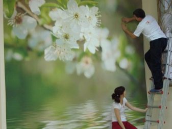 يجب محاذاة جدران ورق الحائط تمامًا, وإلا فلن يكون الحجم مثاليًا. تُباع اللوحة القماشية نفسها في قطعة واحدة ، أو تُقسم إلى أجزاء متساوية إذا كانت الصورة كبيرة جدًا. أثناء اللصق ، يعمل شخصان مع اللوحات ، والثالث يصحح الاتجاهات. يتم لصق المربعات على الوصلات مع التوافق الدقيق للنمط.