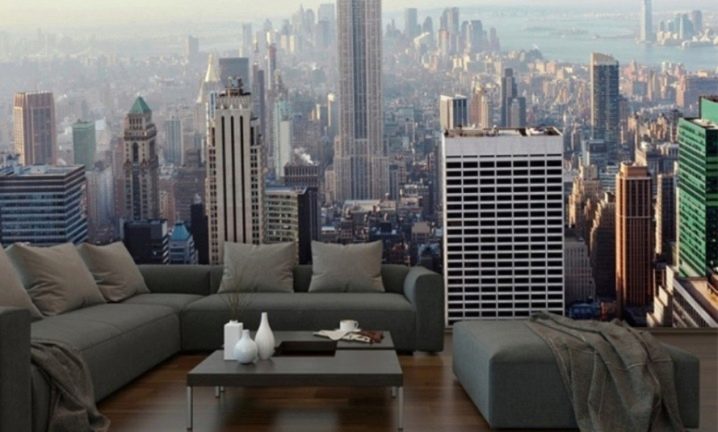 يعطي النمط الحضري لورق الحائط البانورامي انطباعًا كاملاً بالعثور على أثاث على سطح إحدى ناطحات السحاب. الأرائك الداكنة ذات الأشكال العادية لا تركز الأنظار على نفسها ، ولكنها تتناسب عضويا مع بانوراما المدينة.