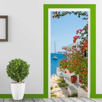 مثال على ورق الحائط أحادي الجانب لأسلوب البحر الأبيض المتوسط مع لونه الأبيض المتأصل يبدو مثيرًا للاهتمام. تظهر أرضية من الألواح الخشبية بوضوح ، تنكسر أمام باب مفتوح ، وخلفها بالتأكيد عتبة أو درجتان ، وأمامها بحر دافئ ونباتات مزهرة ومنزل يوناني متصل. كل شيء يبدو حقيقيًا لدرجة أنك تريد تصديقه.