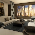 يعطي النمط الحضري لورق الحائط البانورامي انطباعًا كاملاً بالعثور على أثاث على سطح إحدى ناطحات السحاب. الأرائك الداكنة ذات الأشكال العادية لا تركز الأنظار على نفسها ، ولكنها تتناسب عضويا مع بانوراما المدينة.