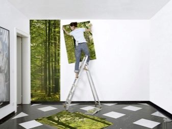 يجب محاذاة جدران ورق الحائط تمامًا, وإلا فلن يكون الحجم مثاليًا. تُباع اللوحة القماشية نفسها في قطعة واحدة ، أو تُقسم إلى أجزاء متساوية إذا كانت الصورة كبيرة جدًا. أثناء اللصق ، يعمل شخصان مع اللوحات ، والثالث يصحح الاتجاهات. يتم لصق المربعات على الوصلات مع التوافق الدقيق للنمط.