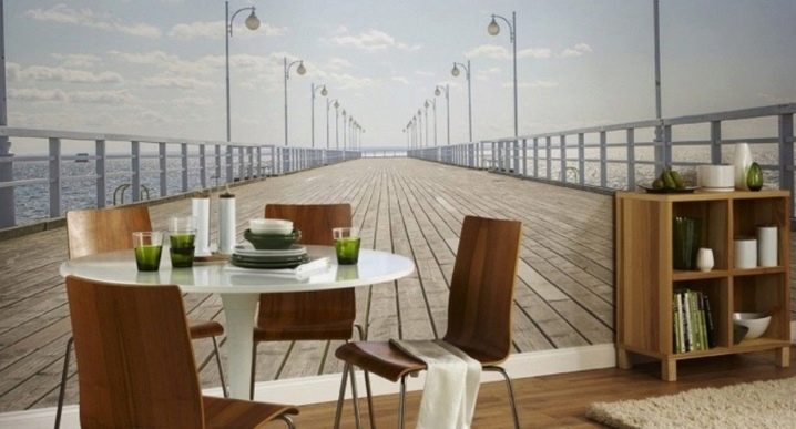 يوسع ورق الحائط المصمم جيدًا المساحة ويخلق الوهم الكامل لوجبة إفطار في قفص الاتهام. لكن التصميم الداخلي لا يمكن أن يتماشى مع الصورة المنفذة بشكل مثالي. إذا قمت بإزالة الحد الأبيض ، اجعل غطاء الأرضية يتناسب مع الصورة ، ستبدو المؤامرة أكثر أصالة. تحجب طاولة السرير الطريق إلى الرصيف وتبدو كعنصر غير ضروري ، وتحول ورق الحائط الغالي إلى صورة عادية.