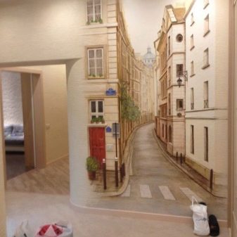 ضع في اعتبارك اختيار منزل ريفي من ورق الحائط المجسم للممر. ليس شارع البلدة القديمة هو الذي يفاجئ ، ولكن كيف دخلت الشقة. تحظى نغمة المبنى والمدينة باحترام كبير بحيث يبدو أنها واحدة.