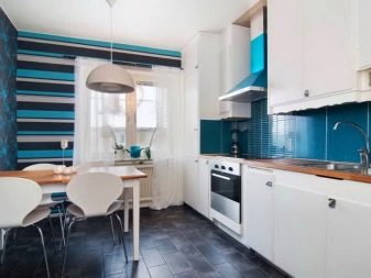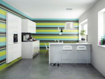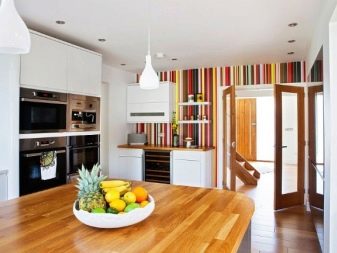 بالنسبة للمطبخ ، من الأفضل اختيار نغمات “دافئة” – وردي ، برتقالي. خيار مثير للاهتمام هو استخدام الخطوط فوق طاولة الطعام ، ولكن بالنسبة للمنطقة المخصصة للعمل ، يمكنك اختيار ظل أحادي اللون.