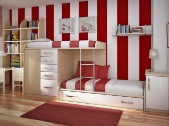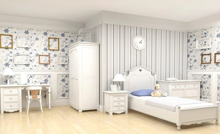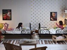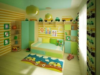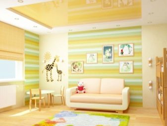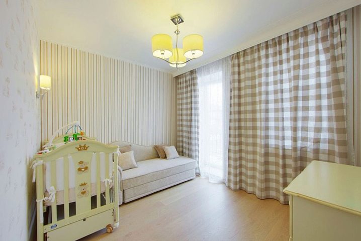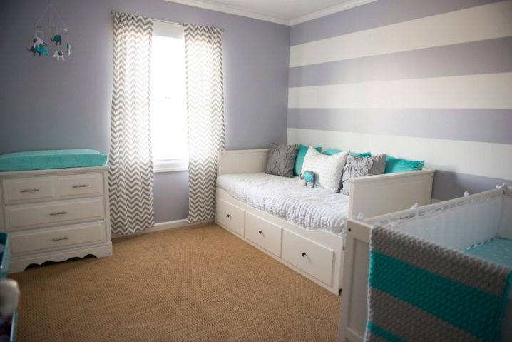 سيكون اختيار شريط واسع للحضانة مناسبًا تمامًا للداخل. بالنسبة لمنطقة بجانب السرير ، يمكنك اختيار ورق حائط مخطط ، ومنطقة موقع الجدول – بلون واحد.