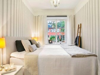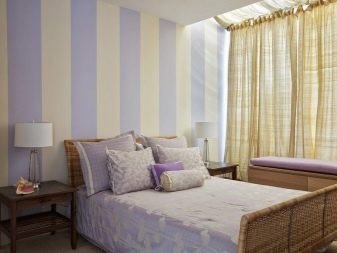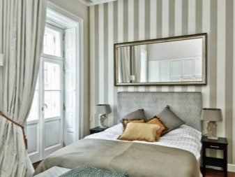 تبدو الخطوط الخفيفة ناعمة وتضيف أناقة إلى الداخل. الراحة في مثل هذه الغرفة ستصبح كاملة حقًا. إذا كنت بحاجة إلى إضفاء الحيوية على الغرفة ، وشحنها بمزاج جيد ، فمن الأفضل استخدام شريط مشرق عرضي. مجموعة متنوعة من اللوحات المخططة ضخمة ، يمكن أن يكون ورق الحائط: