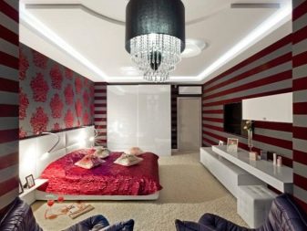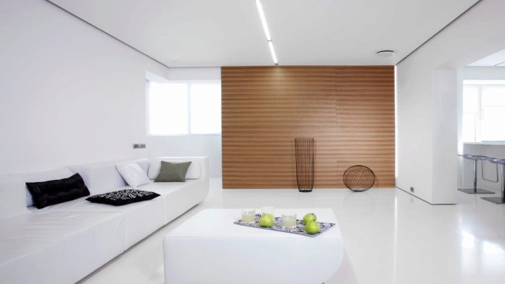 من الأفضل اختيار أغطية ذات خطوط أفقية فقط للمساحات ذات الأسقف العالية ، مع دمجها مع الإضاءة المعدلة بشكل صحيح: يمكن وضع تركيبات الإضاءة هنا ، سواء في الوسط أو على جوانب مختلفة من الغرفة.