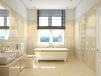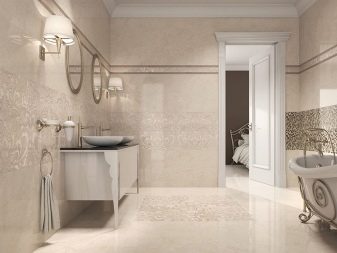 يعكس البلاط اللامع الضوء ويخلق شعورًا نظيفًا متلألئًا. يمكن للألواح الخاصة ، التي تقدمها مجموعة كبيرة من متاجر الأجهزة ، تحويل الحمام إلى زاوية من العالم تحت الماء ، أو شاطئ البحر ، أو بستان غابة ، أو حديقة استوائية. يمكنك إنشاء أي أنماط على الجدران ، والجمع بين جميع أنواع الظلال مع بعضها البعض. على الرغم من الراحة والاسترخاء ، يفضل تغطية الألوان الرقيقة ، على سبيل المثال ، اللون الوردي الباهت أو الفيروز الفاتح.
