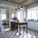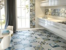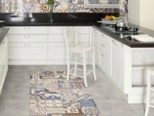 يمكنك اختيار تقليد نمط بلاط الأرضيات الذي يقلد الحجر أو الخشب. إذا كنت تريد شيئًا أكثر تعقيدًا ، فيجوز تكرار نمط بلاط المريلة في تشطيب غطاء الأرضية. بالإضافة إلى المئزر والأرضية ، يمكن وضع البلاط على أسطح عمل المطبخ. من المهم استخدام مواد مقاومة للتأثير. بالنسبة لمثل هذه الأسطح ، يكون البلاط المزجج أكثر ملاءمة: فهو أقل عرضة للتأثيرات الخارجية.