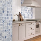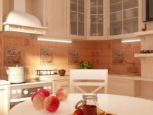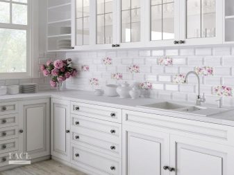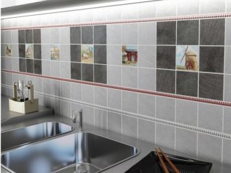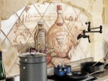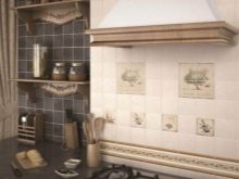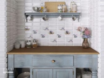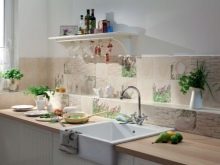 يجب اختيار اللون بحيث يكمل بشكل متناغم خزائن المطبخ. مزيج من بلاط الجدران العادي والعناصر ذات الأنماط والحدود تبدو مثيرة للاهتمام. يتم استخدام موضوعات النباتات وباقات الخزامى والزيتون ومخططات الحياة القروية كنماذج.