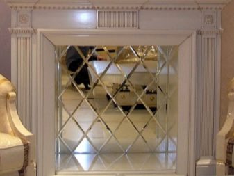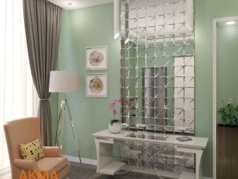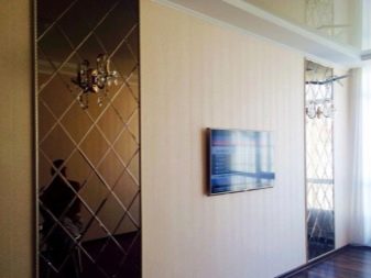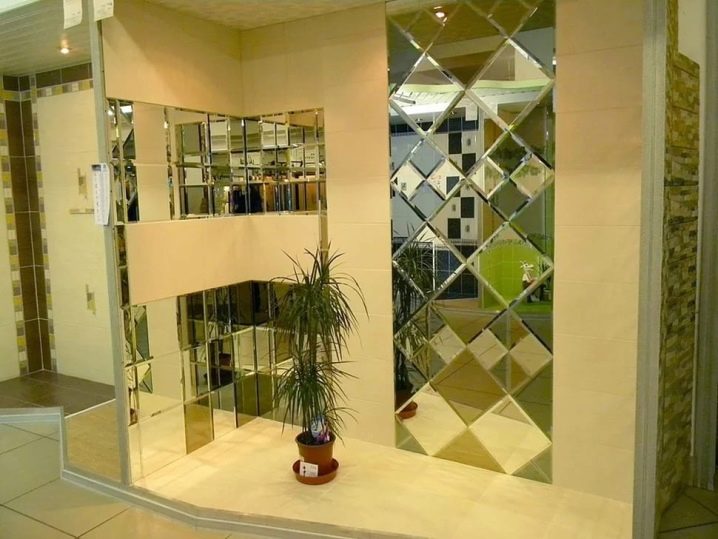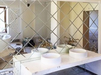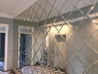 بجانب, بلاط المرآة ليس فقط قياسيًا (مربعًا ، مستطيلًا) ، ولكنه أيضًا مثلث أو على شكل دالتون. هناك أيضًا خيارات لتزيين مساحات الزاوية ، وهي صغيرة الحجم وتتوافق مع الشكل..