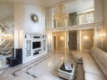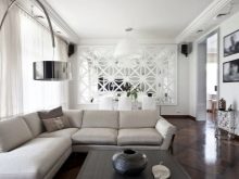 سيبدو الجدار اللامع الذي تم الانتهاء منه ببلاط عاكس كبير رائعًا في غرفة ذات سقف ممتد لامع وأرضية فاتحة. ضع أمامها صوفا زاوية بيضاء فاخرة مع قارورة عربة ، وبجانبها طاولة سوداء مع كراسي جميلة. علق ثريا داكنة بأذرع منحنية فوق الطاولة.