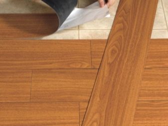 - ذاتية اللصق. تتم إزالة طبقة واقية بعناية من بلاط PVC ، وبعد ذلك يتم تثبيتها بالقاعدة ويتم الضغط عليها برفق لتأمينها.