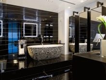 - الطراز الحديث سوف تبدو البلاط الأسود المذهل مثيرة للاهتمام. ومع ذلك ، لا تنس أن استخدام الألوان الداكنة جدًا غالبًا ما يؤدي إلى تأثير غرفة أكثر إحكاما وضيقة. لهذا السبب ، يجب استخدامه بحذر شديد وفقط في غرفة واسعة..