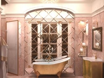 في الحمام ، الذي تم تشطيبه بالبلاط الوردي الفاتح ، سيبدو الجدار رائعًا ، من الأرض إلى السقف ، مزينًا ببلاط عاكس عاكس. مقابل ذلك ، يجب أن تضع الحمام نفسه (يُنصح باختيار نموذج بأسلوب طنان أو كلاسيكي) ، وإلى جانبه حجر رصيف بأرجل منحنية وصنبور عتيق الطراز.