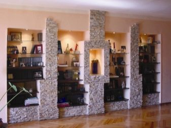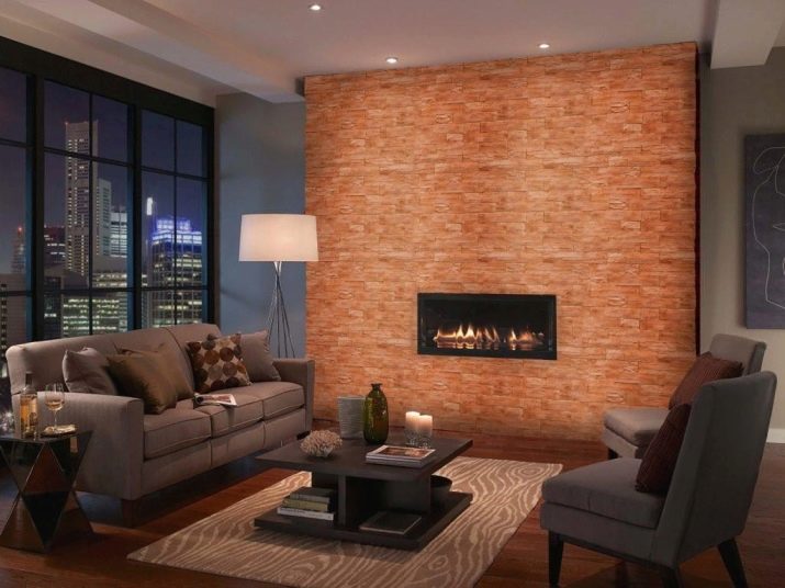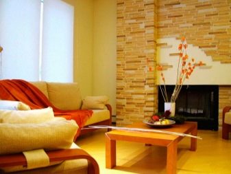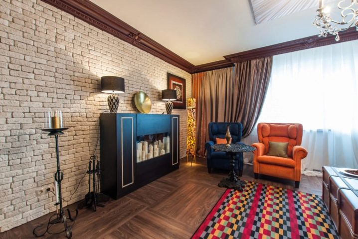 يعتبر بلاط الجبس الذي يقلد الحجر الطبيعي أو الطوب رائعًا لتزيين غرف المعيشة. يمكن استخدام هذه المواد الزخرفية ليس فقط لتزيين الأعمدة والأقسام ، ولكن أيضًا لتزيين الجدار الرئيسي في الغرفة. في الوقت نفسه ، يبدو البلاط الأبيض غير عادي في غرفة المعيشة ؛ تم دمجهما في الأصل مع سقف الغرفة. لكي تخلق لوحة الألوان تباينًا مثيرًا للاهتمام ، يوصى أيضًا بتثبيت إضاءة جيدة في الغرفة ، وإلا في غرفة المعيشة ، بدلاً من الراحة والدفء ، سيتم إنشاء شعور بالبرودة والشفق. يمكن أيضًا أن يكون تبليط الموقد فكرة أصلية..