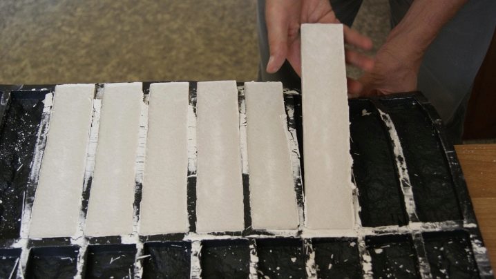 عندما يجف الجبس ، يتم إخراجه ويترك ليجف أكثر.. يجب إزالة المنتجات من القوالب بعناية ، دون انتهاك هيكلها المتكامل. لتسريع عملية التجفيف ، يوصى بوضع البلاط المستقبلي في غرف التجفيف ، مع تجنب أشعة الشمس المباشرة..
