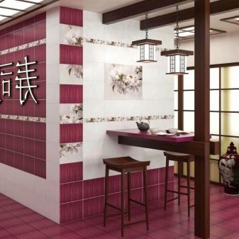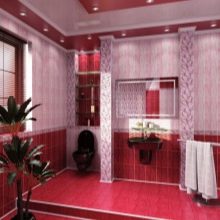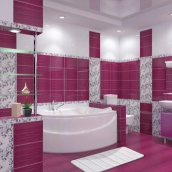 يبدو اللون العنابي متناغمًا مع البلاط الوردي. للأرضيات ، يتم تقديم بلاط بورجوندي. بلاط الجدران باللون العنابي والوردي.