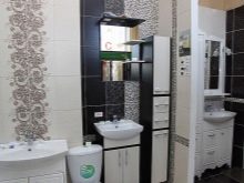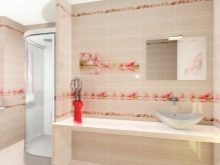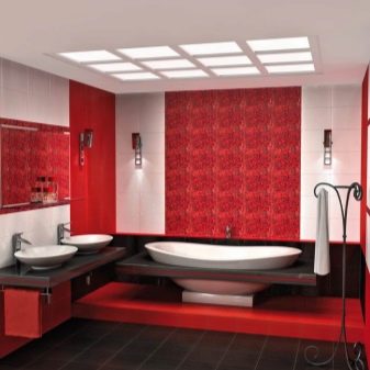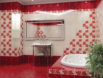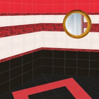 يسمح بلاط الأرضية الأحمر والأسود بتركيبات مثيرة للاهتمام. لاستخدام الجدران ، بالإضافة إلى الظلال الأساسية ، يتم أيضًا تقديم البلاط الأبيض والديكور المزين بالورود الحمراء. إفريز أفقي مصنوع ليتناسب مع الديكور.