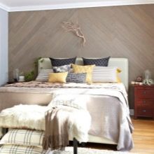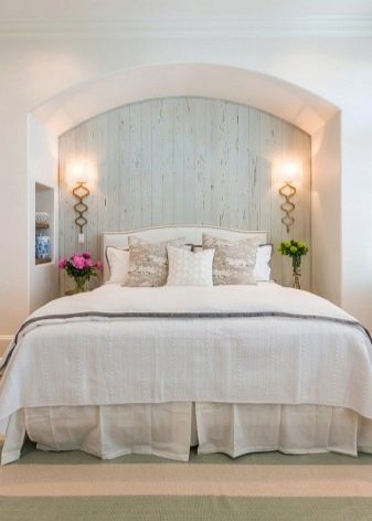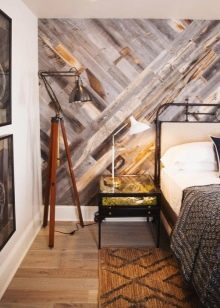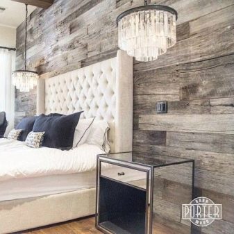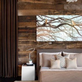 في غرفة النوم ، لا يزال من الأفضل التخلي عن القوام اللامع اللامع وإعطاء الأفضلية للظلال الفاتحة الطبيعية أو البيضاء مع تقليد الطلاء. وإذا قررت تزيين أحد الجدران بورق حائط يشبه الخشب ، فمن الأفضل اختيار الجدار الموجود خلف رأس السرير. في هذا الإصدار ، يمكن أن يكون هناك أي نسخة من النمط والألوان الأكثر اختلافًا ، متوازنة مع نغمات الباستيل في باقي المساحة. لكن من الأفضل استكمال المظهر الطبيعي بإكسسوارات بنفس الأسلوب (مزهريات ، حوامل ، وسائد ، لوحات).