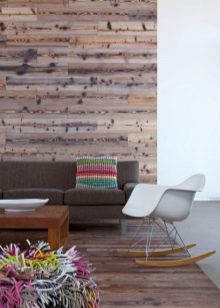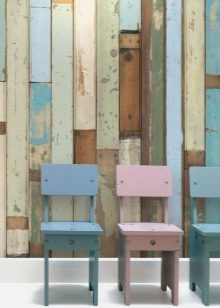 يمكن لعشاق الأصالة إلقاء نظرة فاحصة على ظلال الخشب الأقل شيوعًا والحيوية والاصطناعية في ورق الحائط. سوف يتناسب نمط الألواح الأرجواني أو الأخضر تمامًا مع التصميم الداخلي الطليعي. في هذه الحالة ، يجب اختيار الأثاث بألوان هادئة واستخدام عناصر زخرفية متشابهة في لون الجدران (الوسائد ، الألواح ، الستائر).