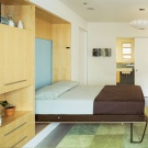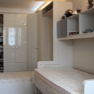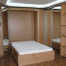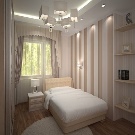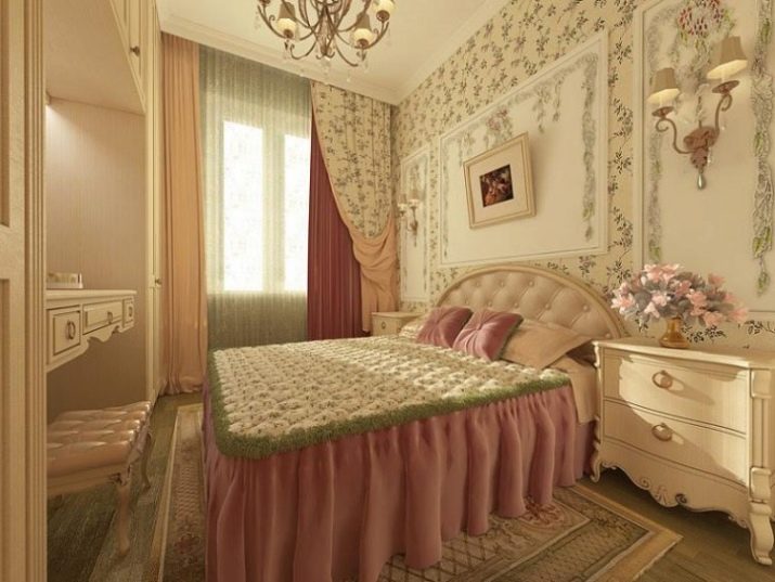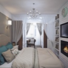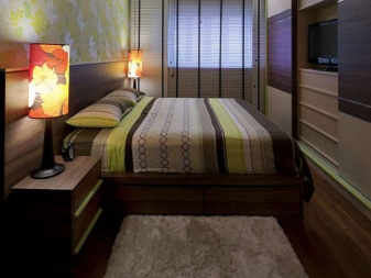 - المفروشات. يتم وضع سرير صغير على الحائط بحيث توجد ممرات من ثلاث جهات. توضع طاولات بجانب السرير على جوانب السرير ، ويتم تثبيت خزانة الملابس بعيدًا عن المدخل قدر الإمكان.