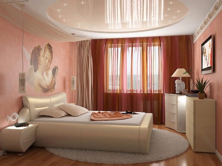 غرفة النوم التي تبلغ مساحتها 13 مترًا صغيرة الحجم ، لذا يجب ألا تستخدم هياكل معقدة ومتعددة المستويات في السقف. الخيار الأفضل هو طلاء أو سقوف متوترة بتأثير لامع.