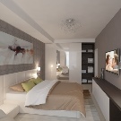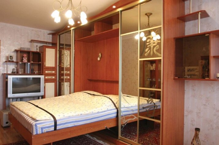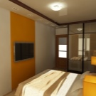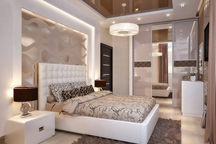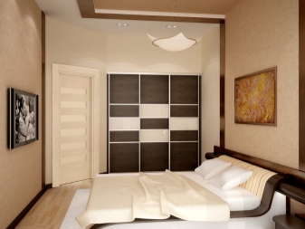 تعتبر خزانة الملابس ذات الأبواب الانزلاقية مع المرايا أو السطح اللامع مثالية. هذا الخيار قادر على زيادة مساحة غرفة النوم بصريًا. تتناسب خزانة الملابس المتوسطة الحجم بشكل جيد مع تصميم الغرفة..