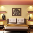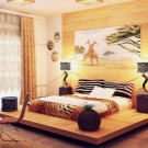 سيبدو النمط الأفريقي غير عادي ومبدع للغاية. لإنشاء تصميم حقيقي ، يجب استخدام ظلال الرمل والبيج والأصفر والبرتقالي. بالنسبة لغرفة النوم الصغيرة ، لا تستخدم الألوان الداكنة جدًا التي تقلل المساحة بصريًا..
