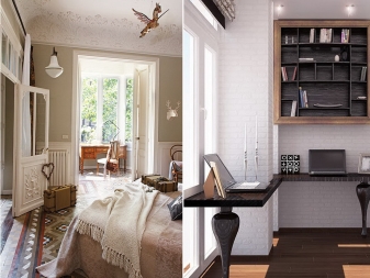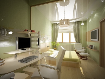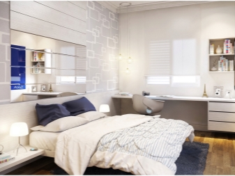 يحدث أنه لا يوجد مكان لوضع مكان العمل ، باستثناء غرفة النوم ، وعليك تقسيم المساحة إلى منطقتين. أهم مهمة في تخطيط غرفة مساحتها 15 مترًا هي عدم تحميلها بالأثاث والأشياء غير الضرورية.. سيكون من الصعب الراحة والعمل في مثل هذه الغرفة. عند ترتيب مثل هذه الغرفة ، يجب أن تختار تركيبات وظيفية وصغيرة الحجم. أريكة قابلة للطي مع خزائن مدمجة بالداخل ، حيث يمكنك تخزين بياضات الباستيل ، ستوفر المساحة بشكل مثالي. خزانة ملابس مع سطح عمل مدمج وأدراج على الجانبين تتناسب تمامًا مع الحائط. هناك نماذج يمكن فيها سحب الطاولة وإعادتها إلى الخزانة حسب الحاجة. من المثير للاهتمام أيضًا اللعب بالنافذة والمساحة المحيطة بها. يمكن إطالة عتبة النافذة وتحويلها إلى طاولة عمل ، وعلى الجانبين خزانتان بارتفاع من السقف إلى الأرض ، حيث يمكنك تخزين الأشياء. سيكون سطح العمل مضاءًا جيدًا ، وسوف يسعدك المنظر من النافذة ويبتهج فقط.