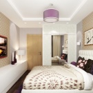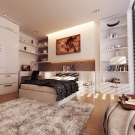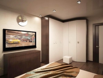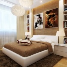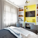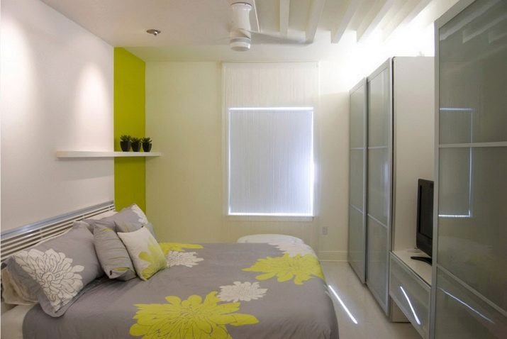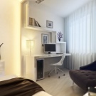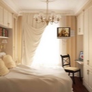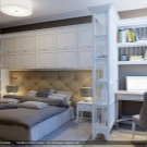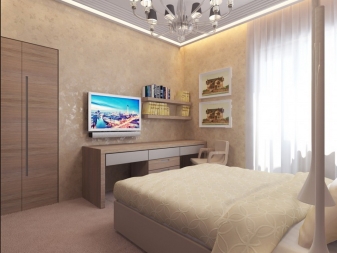 إذا كانت هناك نافذة على الجانب الأيمن ، فمن المستحسن إعطاء الجانب الأيسر من الغرفة أسفل خزانة ملابس صغيرة. من الناحية المثالية ، سيتم بناؤه في الحائط ، وبالتالي توفير المساحة. الحل الأمثل لتوفير المساحة هو وضع خزانة ملابس للملابس والأشياء حول رأس السرير على مساحة الحائط بأكملها. من الأفضل وضع منطقة العمل ، أي طاولة مع كرسي أو كرسي بذراعين ، بجوار النافذة. لن يسهم ضوء الشمس والمنظر الجميل من النافذة إلا في مزاج العمل. يمكنك وضع جهاز تلفزيون على هذه الطاولة لمشاهدة الأفلام قبل النوم..