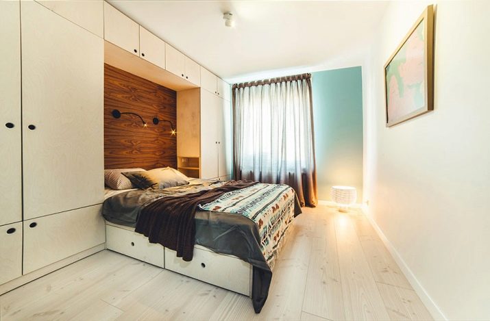 يجب أن يكون التركيز الرئيسي في غرفة النوم على السرير. يجب ألا تنقذ على الصحة وتختار مرتبة سيئة. أفضل للجميع ، إذا كان سرير نوم من قطعة واحدة. ينصح المصممون باختيار الأسرة ذات الأرجل ، لأن هذا ، أولاً ، سيخلق شعورًا بالخفة في الغرفة ، وثانيًا ، يمكن استخدام المساحة الموجودة أسفل السرير وظيفيًا. من المهم جدًا عند تثبيت السرير في المكان المخصص ترك مساحة خالية على الأقل مترًا من حوله للوصول المجاني.. تحتاج إلى التفكير في مكان لتخزين الأشياء. في 15 مربعًا ، ستثقل الخزانات وخزائن الملابس الضخمة المساحة ، لذلك من الأفضل تركيبها في الحائط أو اختيار أحجام صغيرة مدمجة. أيضًا ، تم تجهيز نماذج الأسرة الحديثة بصناديق تخزين مدمجة ، ولا ينبغي إهمالها..
