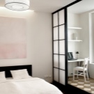 إذا تم استخدام غرفة نوم مستطيلة للعمل ، فلا يمكنك الاستغناء عن تقسيم المساحة إلى مناطق. للقيام بذلك ، يمكنك استخدام أقسام على شكل شاشة أو تعليق ستائر قطنية. ستساعد خزانة السقف أيضًا في تقسيم المساحة..