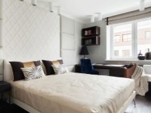- يمكن أن تكون غرفة النوم القياسية المستطيلة في شقة المدينة ذات الألوان الفاتحة مريحة وأصلية في نفس الوقت. أول ما يلفت انتباهك هو جدار اللكنة. إنها رائعة في تقسيم المساحة وتضبط النغمة والمزاج لها..