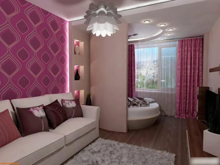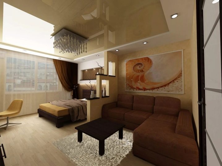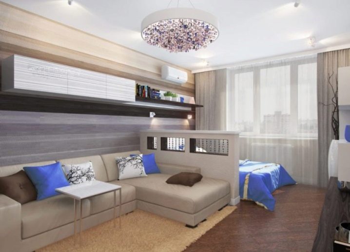 تتطلب القاعة وغرفة النوم في غرفة المعيشة إضاءة منفصلة: من الأفضل تعليق الثريا في منطقة الاستقبال ، ووضع العديد من الأضواء الكاشفة في غرفة النوم – فهي ملائمة لتوجيه وتسليط الضوء على مناطق معينة.